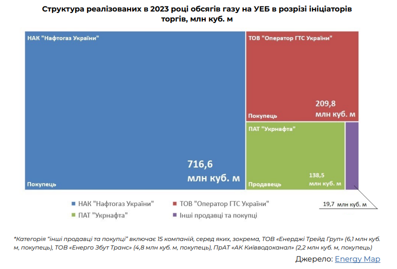 Як виявили автори огляду, в перших трьох кварталах 2023 року торгівля газом на «УЕБ» була висококонцентрованою і суттєво залежала від волі великих гравців – «Нафтогазу», «ОГТСУ», «Укрнафти». Саме їх операції з купівлі-продажу значною мірою визначили ціну, обсяги та умови на яких «блакитне паливо» закуповувалось та продавалось на «УЕБ». Разом з тим, далеко не всім гравцям, які хотіли придбати або збути ресурс, це вдалося: із 44 компаній, які виставляли свої позиції на біржі, лише 18 змогли купити або продати газ.