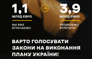 Україна вже недоотримала 1,1 млрд євро фінансової підтримки від ЄС за І квартал 2025 року через невиконання індикаторів Плану України, а також ризикує недоотримати з цієї ж підстави ще 3,9 млрд євро за ІІ-ІV квартали цього ж року. Частина з цих індикаторів — це відсутність ухвалених парламентом законопроєктів. Важливо, що більшість законотворчих індикаторів передбачають не просто ухвалення законів, а набрання ними чинності: тому схвалення має відбуватись щонайменше за місяць до дедлайну (з огляду на випадки блокуючих постанов та часу, необхідного Президенту