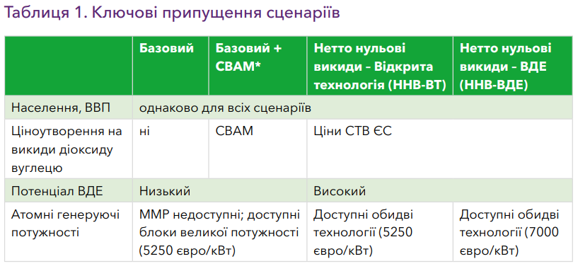 У звіті оцінюється можливість створення електроенергетичної системи з нетто нульовими викидами до 2050 року з урахуванням супровідних витрат за двома сценаріями нетто нульових викидів з різними технологічними портфелями.