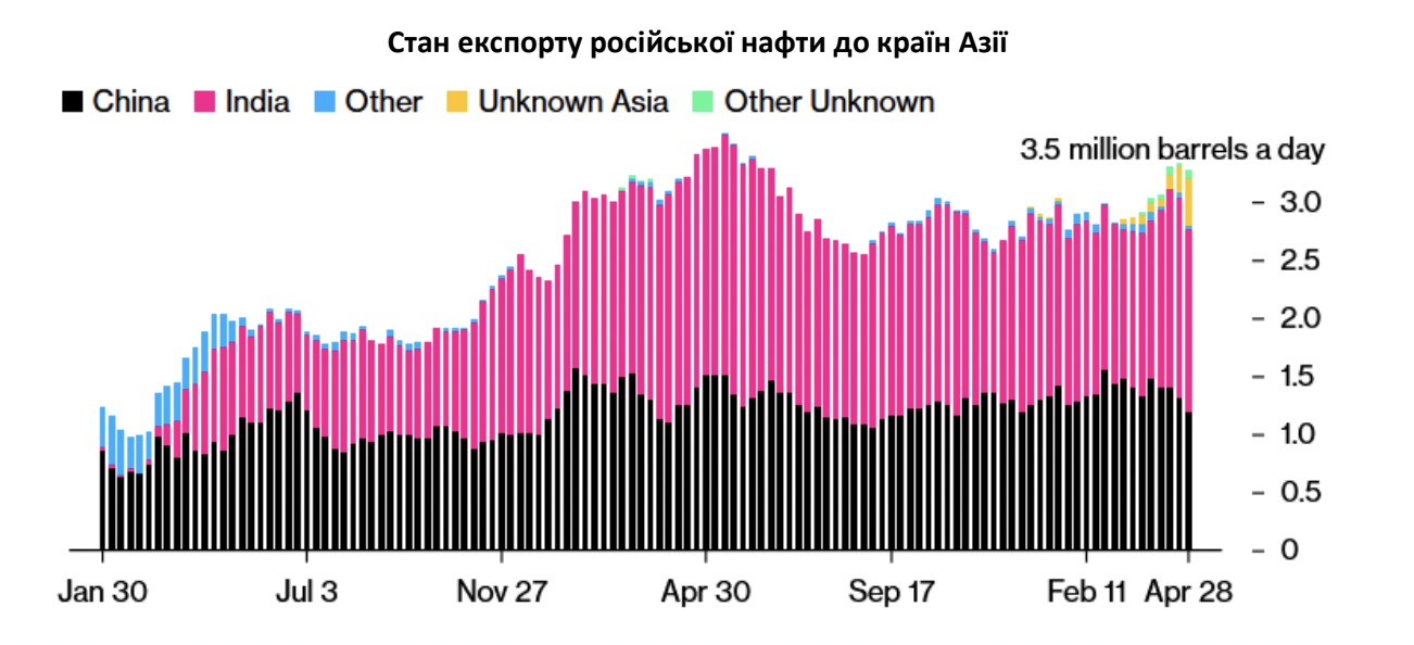 Таким чином, якщо ще станом на початок 2024 року спостерігався спад експорту російської нафти марки Sokol після того, як індійські нафтопереробники відмовилися її приймати через санкції США, то станом на квітень різниця у дефіциті експорту цієї марки майже зникла. Близько 9,1 млн барелів – половина від загального обсягу – були поставлені на нафтопереробні заводи Китаю. Ще 7 млн барелів зрештою повернулися до Індії. Також до Пакистану було доставлено два вантажі з нафтою Sokol. Вартим уваги є факт, що із березня у статистиці російського експорту з’явився пункт «невідомого» експорту, яким маркуються судна, що прямують до Суецького каналу із західних портів росії та не вказують чіткого пункту призначення, а також танкери, які передали свій вантаж невстановленим суднам.