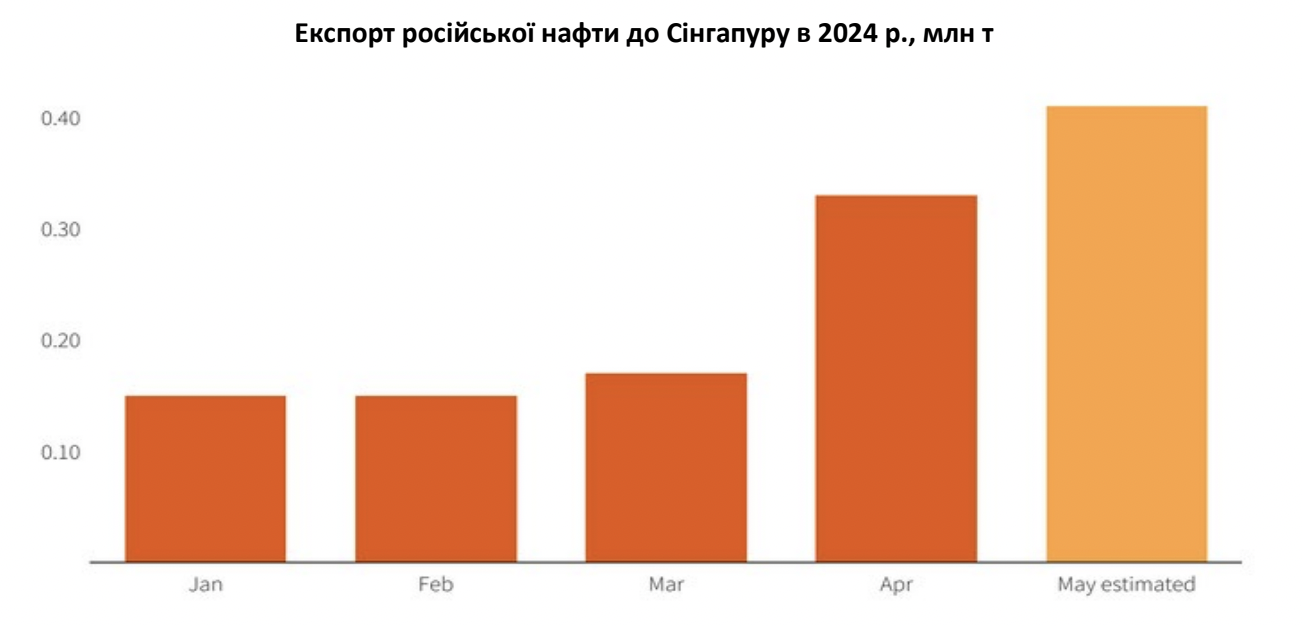 Ще один напрямок російського нафтового експорту – Сінгапур. У травні 2024 року російські поставки в цю країну перевищили показники минулих років зі зростанням приблизно до 415 000-500 000 т. У квітні експорт нафти з росії до Сінгапуру сягнув 329 955 т. Зростання продажу нафти в цьому напрямку приблизно на 16% пов’язують з відновленням експорту з Туапсинського нафтопереробний заводу «Роснєфті», одного із найбільших на півдні росії, який відновив переробку на початку травня 2024 року.