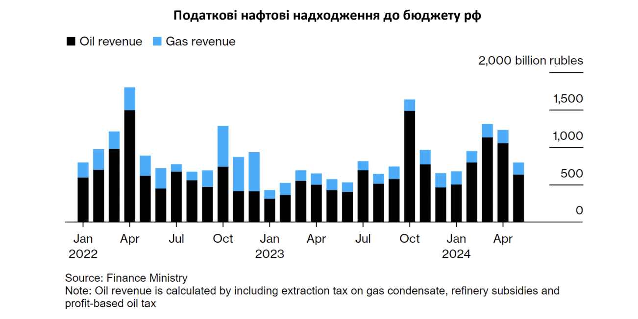 Доходи рф від продажу нафти за травень 2024 року зросли майже на 50% порівняно з травнем 2023 року Згідно з підрахунками Bloomberg, податки з нафтової галузі за цей період зросли до 632,5 млрд рублів (7,1 млрд доларів). Ціна на еталонну марку Urals зросла у травні до 74,98 дол./бар., тоді як у аналогічний період 2023 року ціна становила 58,63 дол./бар.