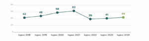 • Остаточний бал України за оцінюванням 2024  року зріс до 44 (порівняно із 41 балами у 2022  році). Цей незначний прогрес (+3 бали, або 7,3%)  доводить можливість покращення прозорості  сектору навіть в умовах війни і режиму ВС. Повномасштабна війна з рф та запровадження режи му ВС спричинили стрімке падіння інформаційної  відкритості енергетики – показник у 2022 році  упав на 24 бали і за шкалою Індексу спустився  до зони «неприйнятної» прозорості. У 2024 році,  незважаючи на різносторонню динаміку по окре мим вимірам і складовим Індексу, загальна оцінка  досягла і незначно перевищила базовий рівень  2018 року (43 бали), проте фундаментальні фак тори впливу на стан прозорості залишилися не змінними