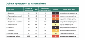 • Оцінювання продемонструвало різносторонню  динаміку прозорості за категоріями Індексу. По шести категоріям – «Природні монополії» (+3  бали), «Постачання» (+3 бали), «Надійність і безпе ка» (+12 балів) «Споживання» (+6 балів), «Політика»  (+8 балів) та «Органи влади» (+5 балів) – відбув ся прогрес. Разом з тим у двох інших категоріях  («Баланси» та «Звітність») спостерігався регрес.  Внаслідок покращень оцінок дві категорії («Споживання» та «Органи влади») перейшли в зону  «середньої» прозорості, тоді які всі інші категорії  залишилися у двох нижніх зонах шкали Індексу  із найгіршою прозорістю – по 3 категорії, відповідно, у зонах «недостатньої» та «неприйнятної»  прозорості. Також, інформаційна відкритість зни зилася у 4 із 24 підкатегорій Індексу, у 9 – зали шилася на минулорічному рівні та у 11 – покращи лася. Така різнонаправлена динаміка свідчить  про доцільність застосування вибіркового/ точкового підходу для відновлення прозорості  сектору з урахуванням потенційних загроз від  розкриття даних.