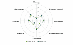 •  Індекс-2024 охоплює 233 індикатори, об’єдна них у 8 категорій і базованих на конкретних нор мативних вимогах і кращих світових практиках  щодо розкриття інформації. Цьогорічне видання  Індексу доповнене трьома новими індикаторами,  пов’язаними з оперативними балансовими дани ми на ринку нафти та рідких палив та обсягом і  вартістю надання послуг зі зростання частки ви робництва електроенергії з ВДЕ. Такі мінімаль ні зміни в рамці оцінювання були застосовані з  метою збереження порівнюваності результатів  для відстеження «чистого» прогресу у прозорості  порівняно з 2023 роком і отримання відповіді на  питання чи можливе покращення інформаційної  відкритості сектору в умовах війни6. Разом з тим,  були оновлені зміст і підстави індикаторів Індексу на основі останнього законодавства ЄС, кращих  європейських та світових практик розкриття да них й звітування. Оцінки, отримані в рамках Індек су, є результатом опрацювання даних відкритих  джерел про функціонування й розвиток енерге тичного сектору за ланцюжком «від виробника до  споживача».