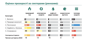 • Індекс оцінює прозорість в розрізі п’яти енерге тичних ринків та крос-секторальних питань. Після  поступового кількарічного покращення впро довж 2018-2021 років, обумовленого, голов ним чином, розвитком нормативно-правової  бази та ступенем регулювання, інформаційна  відкритість енергетичних ринків в умовах вій ни істотно зменшилася і залишається низькою. Зокрема, серед 79 індикаторів, по яким відбулося законодавче обмеження публічності, 53 інди катори (або 67%) носять секторальний характер.  Водночас через низьку базу порівняння, забез печену оцінками Індексу 2023 року, за 4 із 5 рин ків відбулося покращення прозорості в межах 1-6  балів (ринки електроенергії, газу, нафти та рідких  палив, теплової енергії). Лише по ринку енерге тичного вугілля не відбулось жодних зрушень.