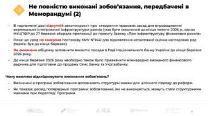Нова Програма МВФ почалась з невиконання структурних маяків. Також не виконано важливі зобов’язання, які уряд та МВФ зафіксували в тексті Меморандуму. Йдеться про широкий спектр кроків передусім в фінансовій та фіскальній політиці.