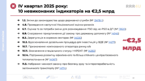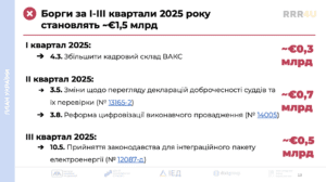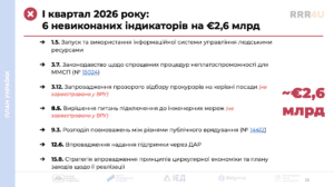 - Із 8 індикаторів, які потрібно виконати до кінця І кварталу 2026 року, виконано лише 1, натомість не виконано 7 індикаторів на €2,6 млрд