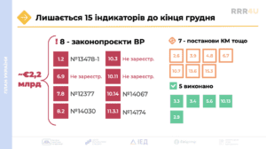 - Прослідковується високий ризик невиконання індикаторів за IV квартал: 1 місяць для вчасного ухвалення низки законопроєктів виглядає малореалістичним