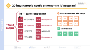 - Високий ризик невиконання низки індикаторів за IV квартал: залишається всього 2 місяці для ухвалення низки законопроєктів.