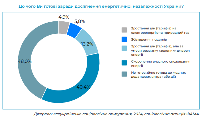 до 25,4%) та скорочення шкідливого впливу на довкілля (з 35,1% до 14,7%). Попри високий рівень підтримки енергетичної незалежності, 48% респондентів не готові до жодних додаткових витрат або дій задля її досягнення.