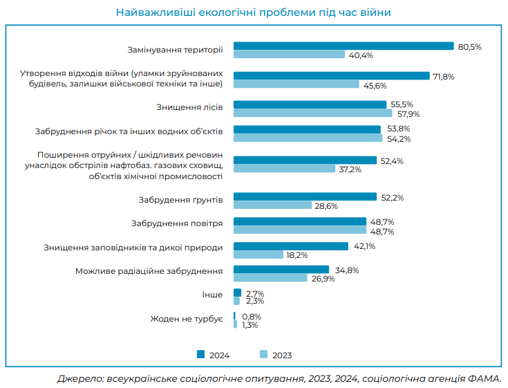 Серед «лідерів» екологічних проблем під час війни – замінування території (80,5%) та утворення відходів війни (уламки зруйнованих будівель, залишки військової техніки та інше) (71,8%). У порівнянні з результатами соціологічного опитування, проведеного на початку 2023 року, збільшилась кількість людей, яких турбують практично усі запропоновані екологічні проблеми. Найбільше зростання спостерігається щодо замінування територій, де частка зросла з 40,4% аж до 80,5%. Частка тих, кого турбує питання можливого радіаційного забруднення, хоча і зросла порівняно з 2023 роком (34,8%), кількість громадян, що вважають цю проблему серйозною залишається нижчою порівняно з іншими проблемами.