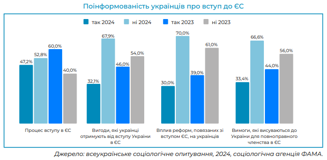 Українці не отримують достатньо інформації з питань майбутнього членства в ЄС. Більше того, показники поінформованості лише знизились, порівняно з результатами опитування 2023 року.