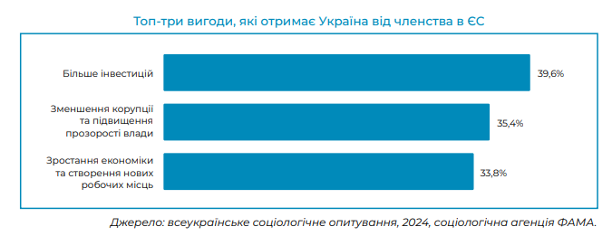 З іншого боку, українці вважають, що основною вигодою для України від членства в ЄС є збільшення обсягів інвестицій (39,6%). Друге та третє місце в рейтингу – це зменшення рівня корупції та підвищення прозорості влади (35,4%), а також зростання економіки та створення нових робочих місць (33,8%) відповідно. Що стосується делегування прийняття важливих рішень Європейському Союзу, респонденти сприймають цю перспективу нейтрально (28,3%), радше позитивно (23,8%) та позитивно (23,0%). Тобто, більше половини українців схвально ставляться до того, що певні рішення у майбутньому будуть прийматись на рівні ЄС, а не на національному.