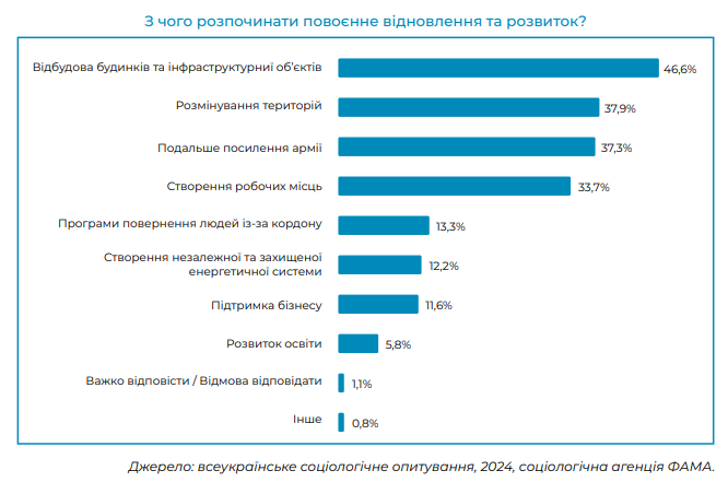 Опитані українці вважають, що повоєнну відбудову і розвиток України необхідно розпочинати з відбудови будинків та інфраструктурних об’єктів.
