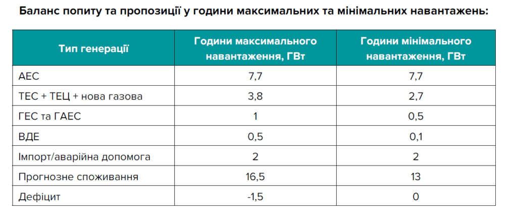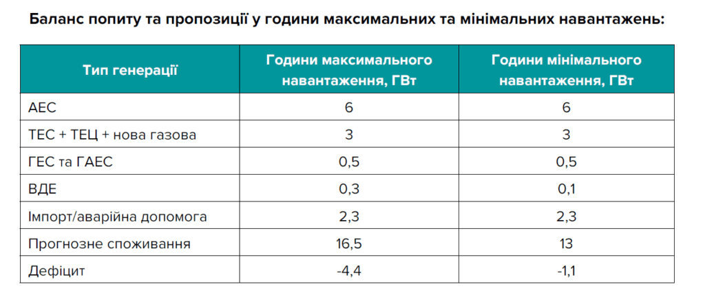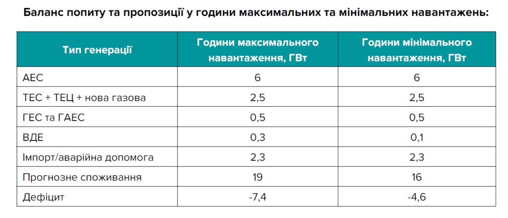 Доступна потужність скоротиться до 12,1 ГВт, дефіцит у пікові години сягне 4,4 ГВт. Система працюватиме в режимі перманентного дефіциту практично цілодобово з LOLP 100%. Очікуваний обсяг енергії, що не постачатиметься, становитиме близько 21-22% від споживання.