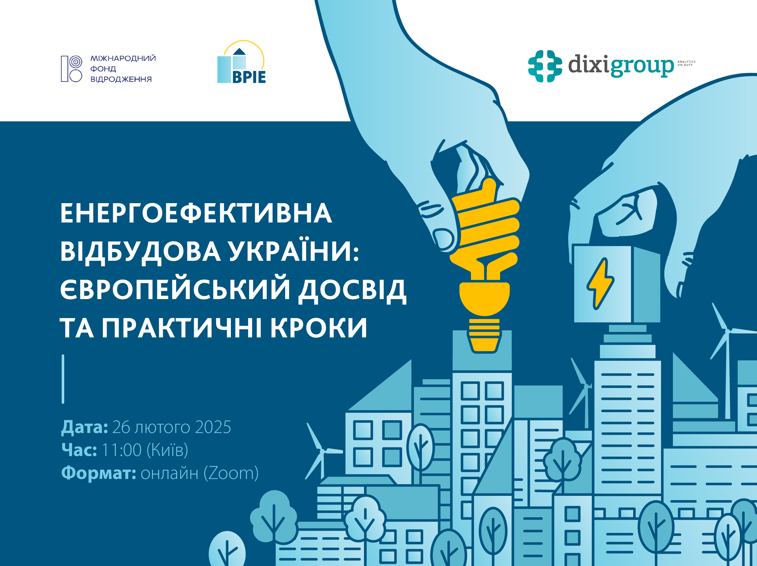 26 лютого запрошуємо на онлайн-презентацію аналітичного документу “Покроковий план енергоефективної відбудови України”, підготовленого DiXi Group  у співпраці з аналітичним центром BPIE. Захід присвячено аналізу політик і ініціатив енергоефективності у будівлях в ЄС та Україні, обговоренню першочергових кроків для енергоефективної відбудови на рівні регіонів, міст і громад, а також перспективам реалізації проєктів за підтримки міжнародних інституцій.