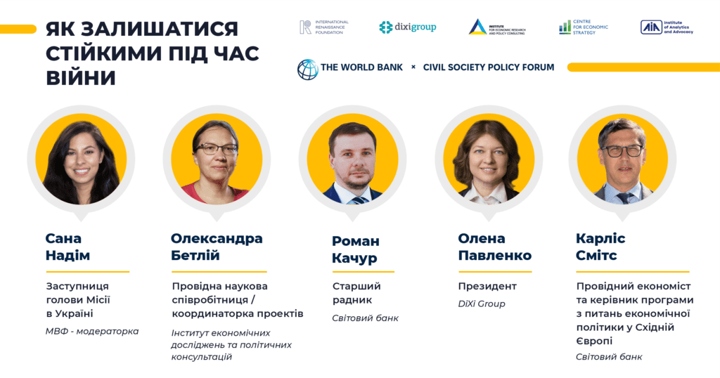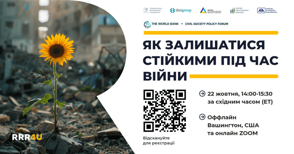 22 жовтня ми поговоримо «Як залишатися стійкими під час війни» під час панельної сесії Форуму політики громадянського суспільства в рамках Щорічних зборів Міжнародного валютного фонду і Світового банку. Відповідь на це питання важливе не лише для України, але й для багатьох інших країн, які стикаються із зовнішніми ризиками та загрозами.