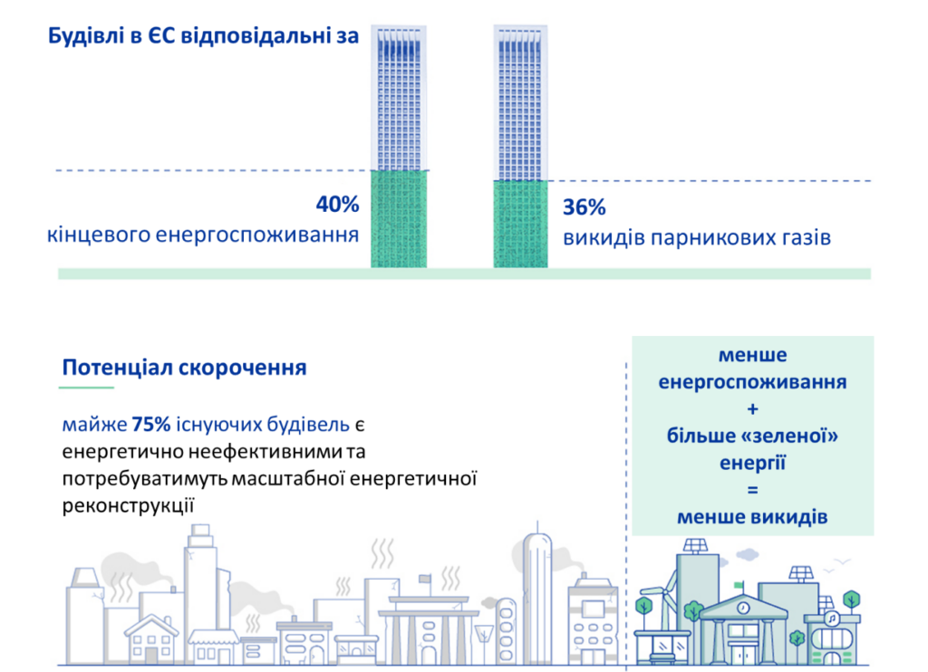 За даними Єврокомісії, на будівлі в ЄС припадає близько 40% споживання електроенергії та більше половини споживання газу (в основному через опалення, охолодження та постачання гарячої води), а також 35% викидів парникових газів. Близько 35% будівель в ЄС старше 50 років і майже 75% фонду будівель є енергоНЕефективними. При цьому, середньорічний показник енергетичної модернізації становить лише близько 1%.