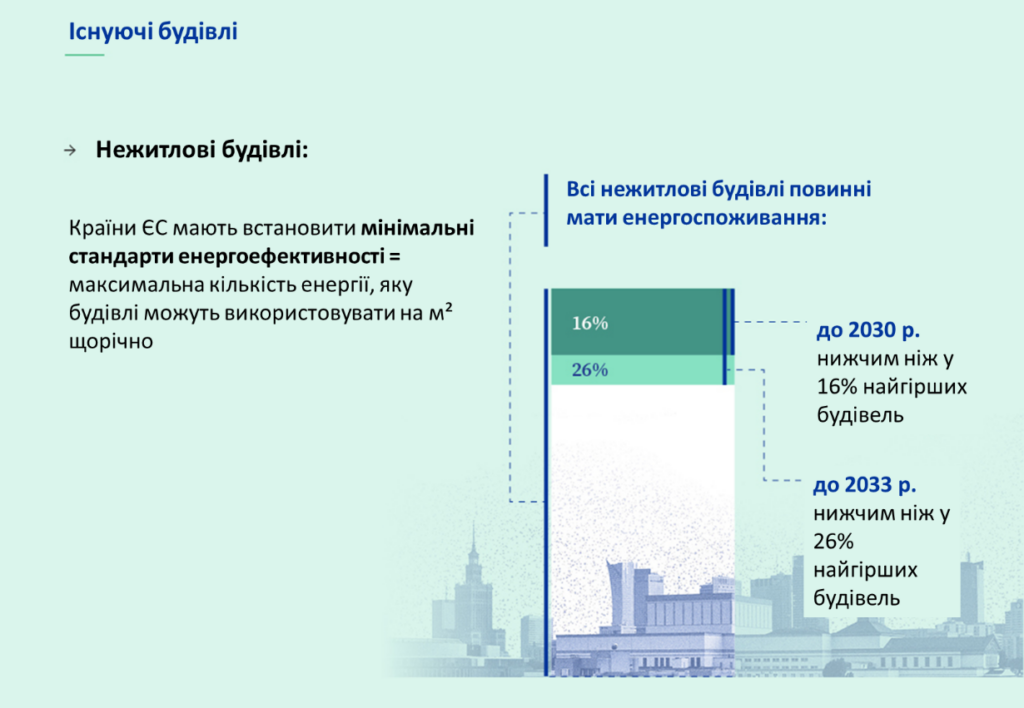 Для нежитлових будівель оновлена Директива вводить мінімальні стандарти енергетичної ефективності, які гарантують, що такі будівлі не перевищують визначену максимальну кількість первинної або кінцевої енергії, яку вони можуть використовувати щорічно на одиницю площі (м2).