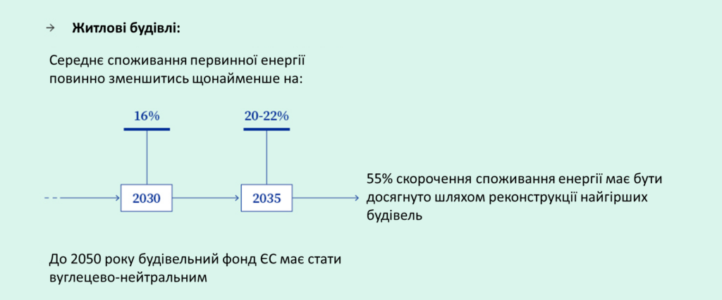 Щодо житлових будівель країни ЄС мають забезпечити, щоб середнє споживання первинної енергії було скорочено на 16% до 2030 р. та на 20-22% до 2035 р. Крім того, принаймні 55% такого скорочення має бути досягнуто шляхом реконструкції 43% найгірших за характеристиками будівель.