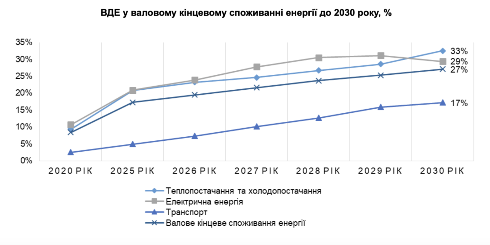 Відповідно до НПД ВЕ 2030, частка відновлюваних джерел енергії у валовому кінцевому споживанні енергії у 2030 році становитиме 27%, а саме: