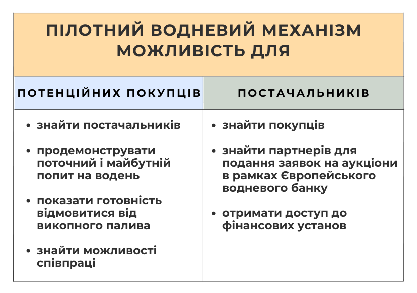 Пілотний механізм збиратиме, оброблятиме та надаватиме доступ до інформації про попит і пропозицію на “зелений” водень та його похідних. Це допоможе покупцям співпрацювати з європейськими та іноземними постачальниками. Механізм також збиратиме й опрацьовуватиме ринкові дані щодо потоків водню та рівня цін. Все це буде відбуватись під керівництвом Європейського водневого банку, а сам механізм працюватиме впродовж п’яти років.