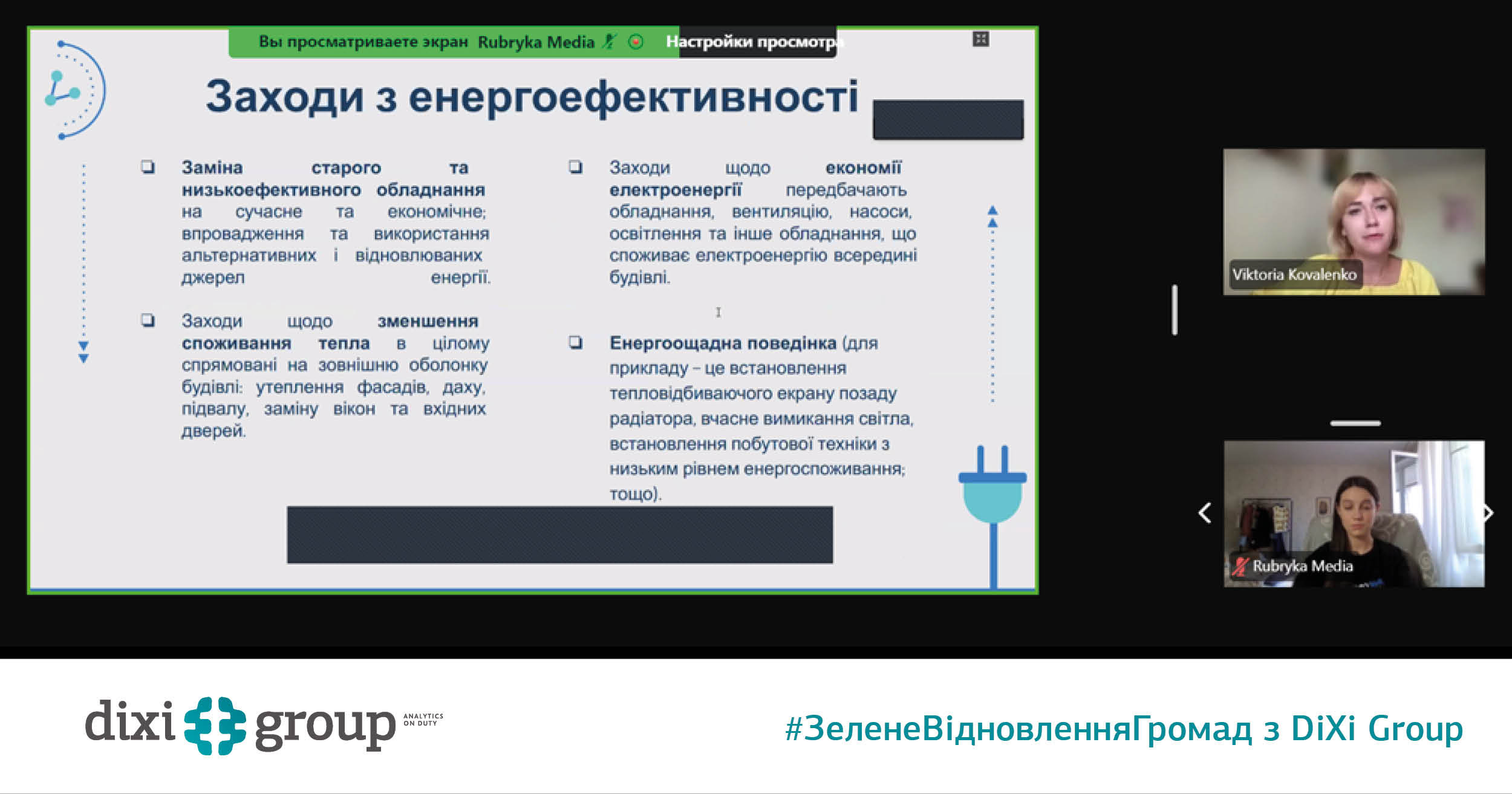 Про те, як зробити українські громади енергоефективними, генеральна менеджерка у сфері сталого розвитку DiXi Group Вікторія Коваленко розповіла під час онлайн заходу «РішенняХаб: Екологічна відбудова України», організованого виданням “Рубрика” спільно з медіамережею “Вікно Відновлення”.
