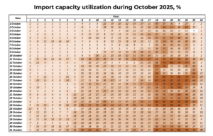 The maximum approved commercial import capacity from the EU has remained at 2.1 GW (equivalent to two large nuclear power units) since December 2024. In October 2025, the average utilization rate was 22.6%, with a peak on October 18 at 8:00-9:00 p.m. (84.4%) and the only hour of the month when no electricity was imported (October 3 at 10:00-11:00 p.m.).