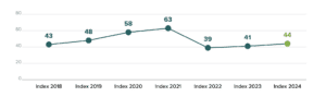 • Ukraine’s final score for the 2024 assessment rose to 44 (compared to 41 points in 2023). This slight progress (+3 points, or 7.3%) proves that it is possible to improve transparency in the sector even in conditions of war and martial law. The full-scale aggression of Russia and the introduction of martial law caused a sharp decline in the transparency of the energy sector – the total score fell by 24 points in 2022 and dropped to the “unacceptable” transparency zone on the Index scale. In 2024, despite mixed dynamics in individual dimensions and components of the Index, the overall score reached and slightly exceeded the 2018 baseline (43 points), but the fundamental factors influencing transparency remained unchanged.