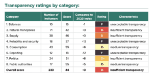 • The progress made in transparency has, among other things, led to a reduction in the number of “black boxes” in the energy sector. The “black box” index decreased by 5 percentage points, from 36% to 31%. Thus, for almost a third of the indicators, information remains closed or completely absent.
