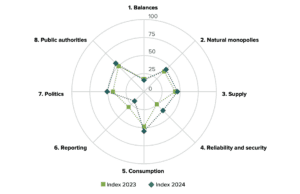 • The assessment demonstrated different dynamics of transparency across the Index categories. Progress was made in six categories: “Natural Monopolies” (+3 points), “Supply” (+3 points), “Reliability and security” (+12 points), “Consumption” (+6 points), “Policy” (+8 points), and “Public Authorities” (+5 points). At the same time, two other categories (“Balances” and “Reporting”) saw a decline. As a result of higher scores, two categories (“Consumption” and “ Public Authorities”) moved into the “medium” transparency zone, while all other categories remained in the two bottom zones of the Index scale with the worst transparency – 3 categories each in the zones of “insufficient” and “unacceptable” transparency, respectively. In addition, information openness declined for 4 of the 24 subcategories of the Index, remained at previous year’s level for 9 subcategories, and improved in 11. Such mixed dynamics indicate the advisability of applying a selective/targeted approach to restoring transparency in the sector, taking into account the potential threats stemming from data disclosure.