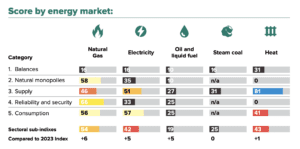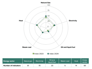 • The Index enables to assess transparency by five energy markets and cross-sectoral issues. After several years of gradual improvement between 2018 and 2021, mainly due to the development of the regulatory framework, the transparency of energy markets has significantly decreased due to the war and remains low. In particular, among the 79 indicators for which there have been legislative restrictions on publication, 53 indicators (or 67%) are sectoral in nature. At the same time, due to the low base of comparison provided by the 2023 Index assessment, 4 out of 5 markets saw an improvement in transparency within the range of 1-6 points (electricity, gas, oil and liquid fuel, and heat markets). Only the score for the steam coal market remained at 2023 level.