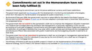 New IMF Programme began with Ukraine’s failure to meet structural benchmarks. Important commitments that the government and the IMF set out in the Memorandum have also not been fulfilled. These include a wide range of measures, primarily in financial and fiscal policy.
