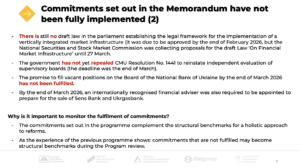 By the end of March, Ukraine was due to have met three structural benchmarks – two structural benchmarks were not completed on time, and one is at risk of non-compliance: