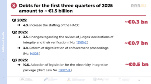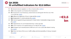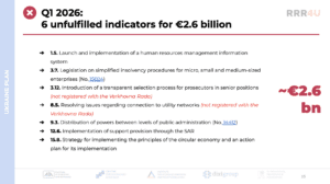 - Out of the 8 indicators to be completed by the end of Q1 2026, only 1 has been met, while 7 indicators worth €2.6 billion remain unmet