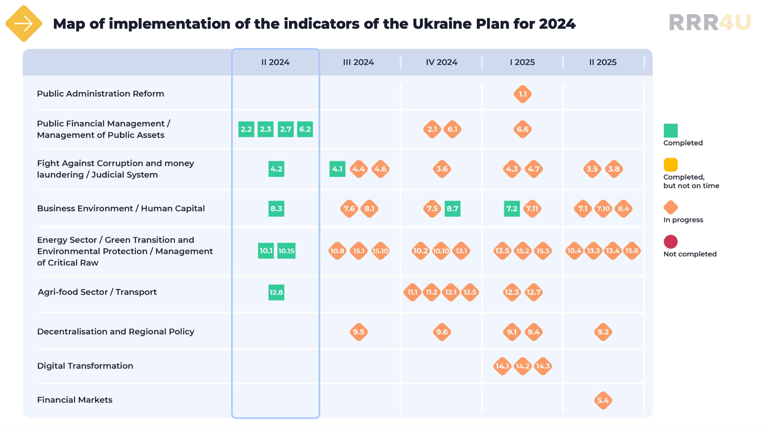 ➔ On July 16, the Ministry of Economy reported that Ukraine had taken all the necessary steps to meet the indicators for the second quarter of 2024 envisaged by the Plan and sent a request for EUR 4.2 bn to the EU Commission on July 9.