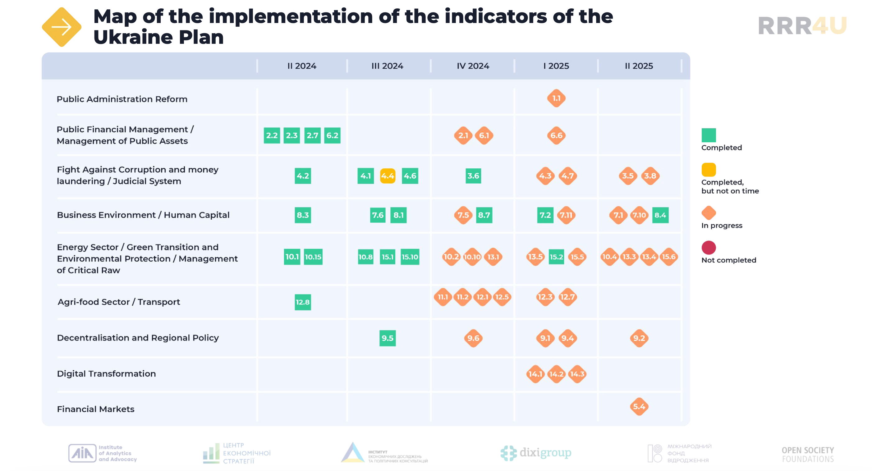 Successful cooperation with international partners remains critical for Ukraine. It is crucial for the financing of priority state budget expenditures (domestic revenues are used for security and defence). That is why the RRR4U Consortium continues to regularly monitor Ukraine’s compliance with the terms of the IMF financing programme and implementation of the Ukraine Plan, the fulfillment of which is the basis for providing assistance from the EU within the Ukraine Facility.