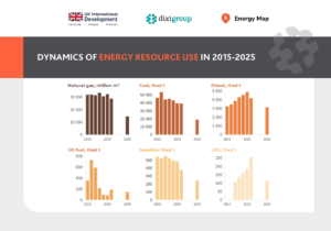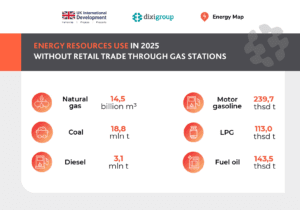 According to Energy Map, in 2025 Ukrainian enterprises used 14.5 billion cubic meters of natural gas, 18.8 million tonnes of hard coal, 3.1 million tonnes of diesel fuel, 239.7 thousand tonnes of gasoline, 143.5 thousand tonnes of fuel oil, and 113.0 thousand tonnes of liquefied petroleum gas (propane and butane).