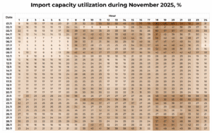 The maximum agreed commercial import capacity from the EU from December 2024 is 2.1 GW (equivalent to two large nuclear power units). In November 2025, average utilization reached 27.4%, peaking on 1 November between 17:00-18:00 at 88.3% and dropping to a minimum of 5.3% on 8 November between 01:00-02:00. During peak evening demand hours, capacity utilization increases significantly.