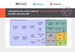 Imports of oil and petroleum products (excluding crude) in 2025 amounted to 8.2 million tonnes worth $6.6 billion, which is $0.2 billion less than in 2024. The main exporting countries remained Poland (16.2% of expenditures), Greece (15.1%), Lithuania (11.9%), and Türkiye (9.7%). In total, these energy resources were imported from 52 countries.