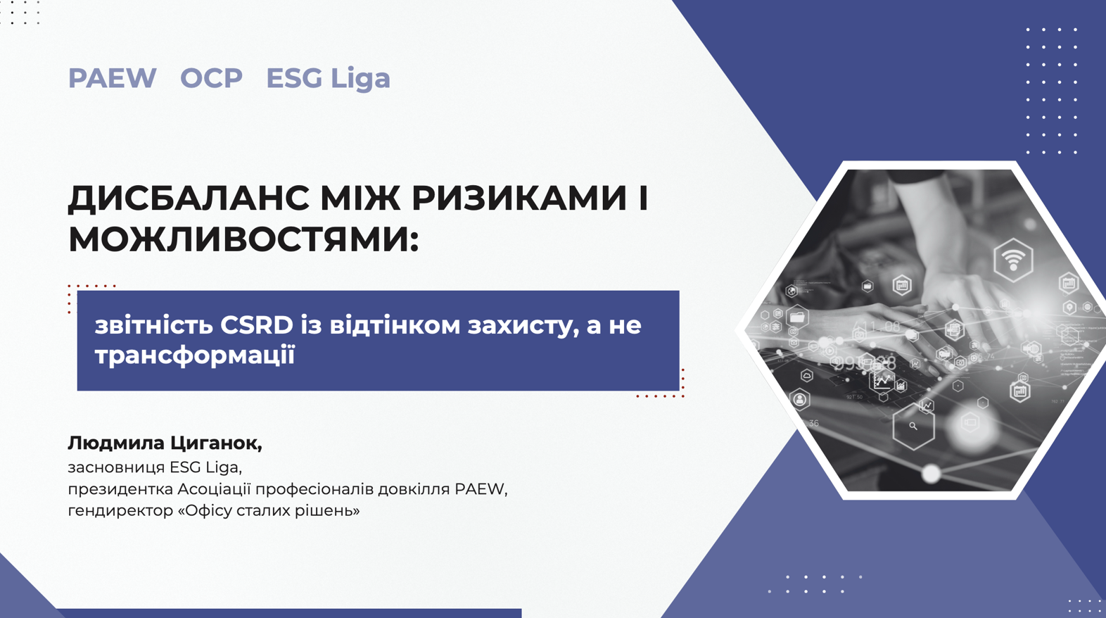 “The first CSRD reports we analyzed at ESG Liga PAEW revealed a paradox: companies readily discuss risks but remain silent about opportunities. 95% report on threats, only 16% on sustainable development potential. We see reporting being used as a compliance tool rather than transformation. This is not a failure, but a signal: companies are only learning to view sustainable development not as a burden, but as the economy of a new generation. For Ukrainian business, this is an opportunity not to copy mistakes, but to go further—to immediately build connections between ESG and financial sustainability, between analytics and action. We consider it necessary to jointly develop a ‘Ukrainian adapted ESG standard’ that accounts for the realities of war and leaves room for humanity, progress, and trust,” emphasized Liudmyla Tsyganok. The expert also recommended using existing standards (GRI, TCFD, SASB) as a foundation for gradual transition to ESRS.