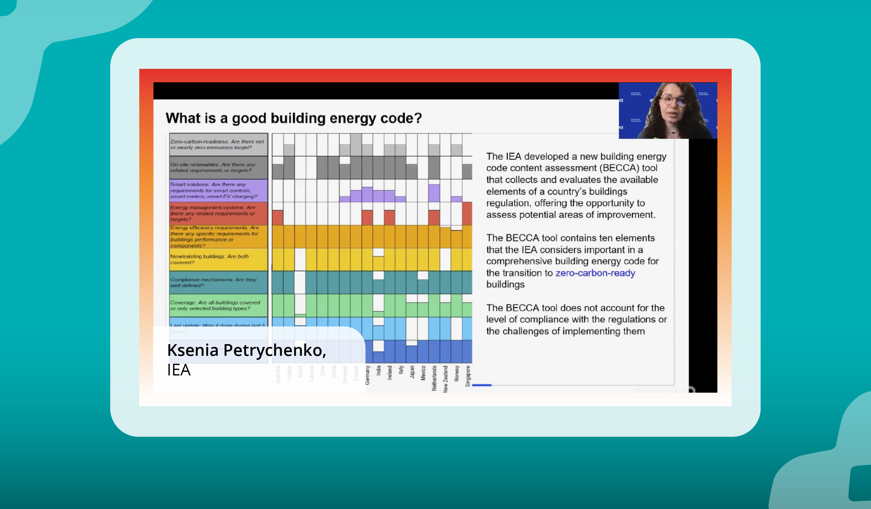 Також під час заходу політична аналітикиня Офісу енергоефективності та інклюзивних переходів Міжнародного енергетичного агентства Ксенія Петриченко, представила кращі практики у впровадженні енергоефективних технологій та ініціатив у секторі будівель. Зокрема відмітила і роботу України в цьому напрямку.
