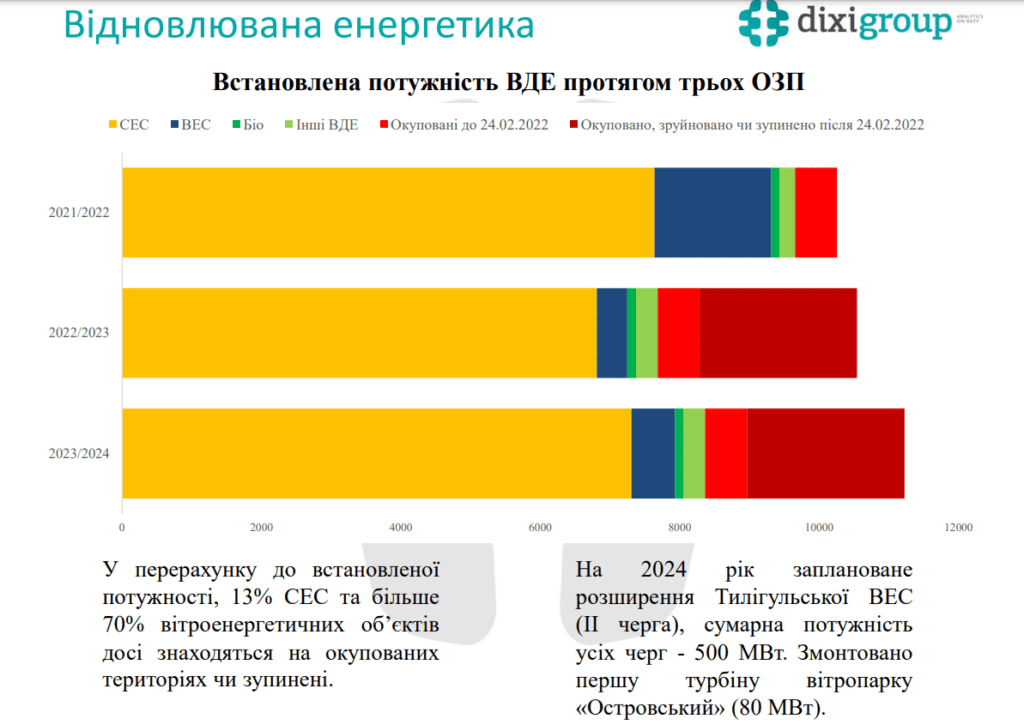 На початку 2024 року встановлена потужність ВДЕ хоч і перетнула позначку у 10 ГВт, проте близько 2,5 ГВт, що орієнтовно 24% потужності перебувають на окупованих територіях. 13% сонячних електростанцій та 70% вітроенергетичних об’єктів досі знаходяться на окупованих територіях.