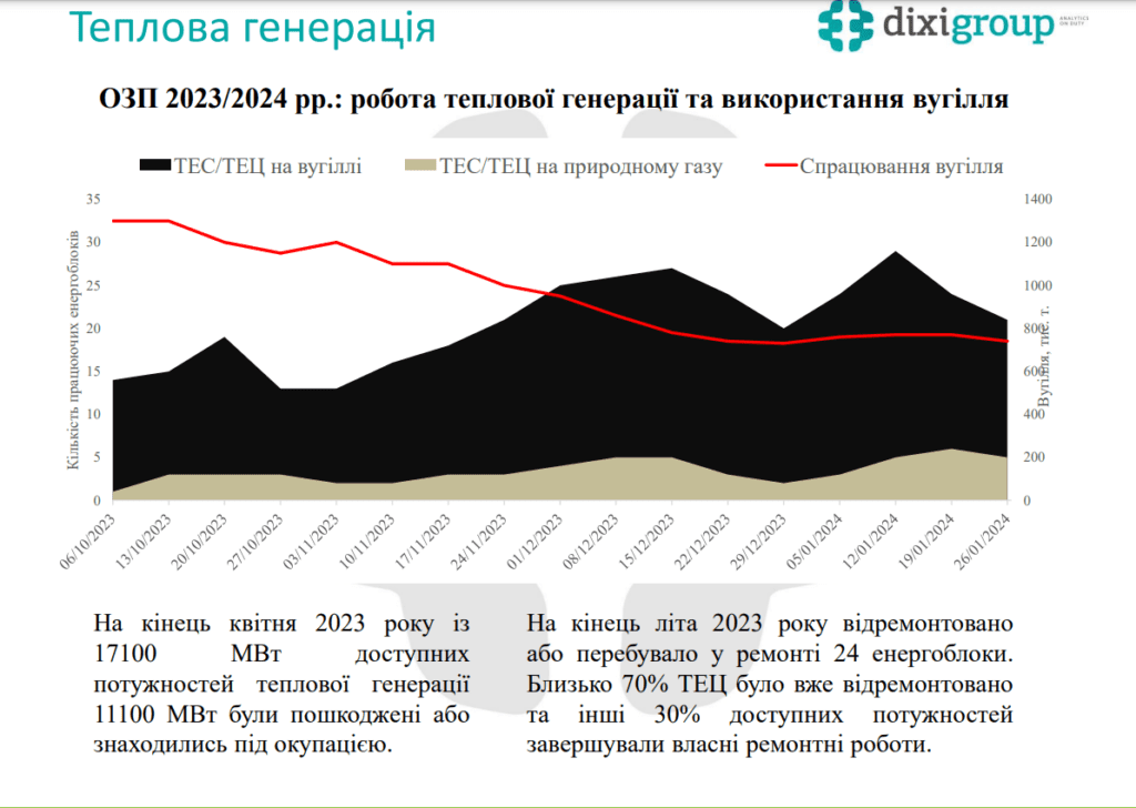 «Через значну потребу в регулюванні при дефіциті електроенергії і в поточному ОЗП енергоблоки ТЕС/ТЕЦ сумарно працювали більшу кількість годин, ніж у попередніх періодах. Звісно це позначилося на використанні вугілля, яке зменшувалося на складах, особливо, у грудні-січні. Відносно тепла погода внесла корективи, що дало змогу пройти зиму стабільно. Водночас, зазнала втрат вугільна генерація», – зазначила Олена Лапенко.