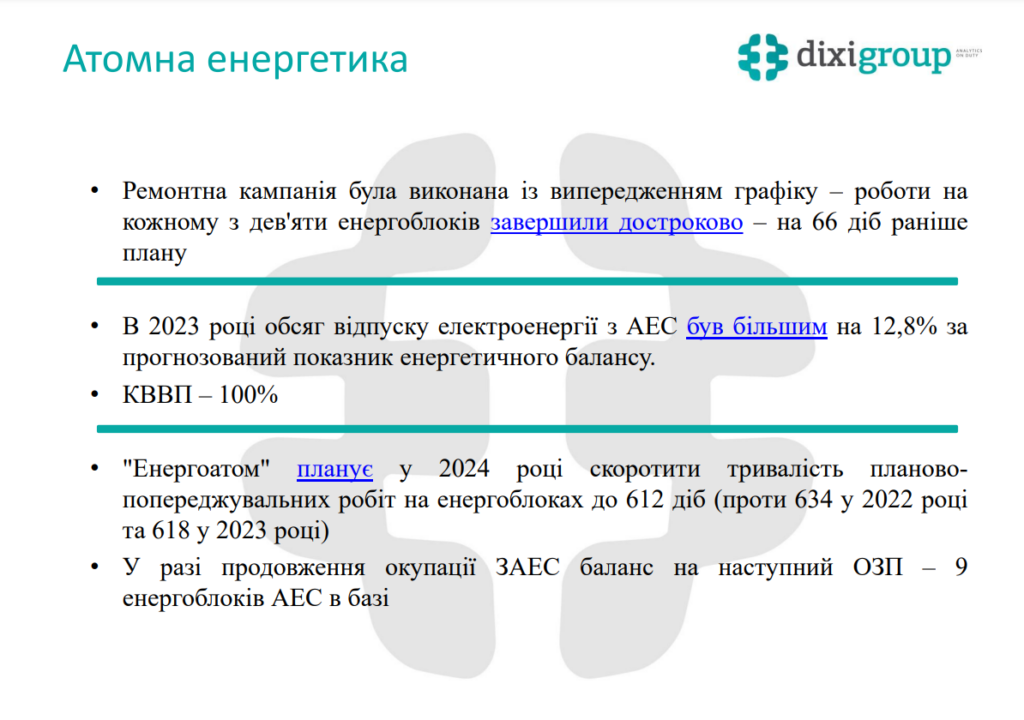 Найстабільнішою складовою енергосистеми лишається атомна генерація, усі енергоблоки якої на підконтрольній Україні території, працювали всю зиму. Основне навантаження покриття споживання припало саме на них. Дев’ять атомних енергоблоків в минулому році збільшили на 12,8% відпуск електроенергії. Також за даними Енергоатома, коєфіцієнт використання встановленої потужності атомних блоків досяг 100%.