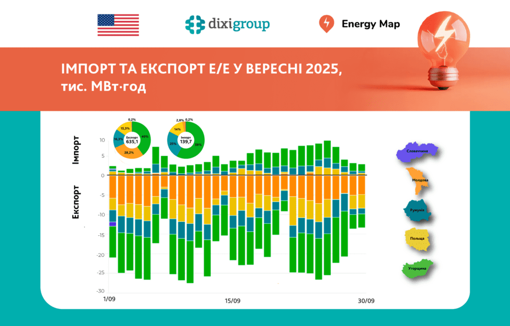 За даними Energy Map, у вересні 2025 року Україна експортувала 635,1 тис. МВт·год електроенергії, що на 41% більше, ніж у серпні. Це найвищий місячний показник експорту з весни 2020 року та четвертий місяць поспіль, коли країна є нетто-експортером електроенергії. Водночас імпорт скоротився на 47%, до 139,7 тис. МВт·год.