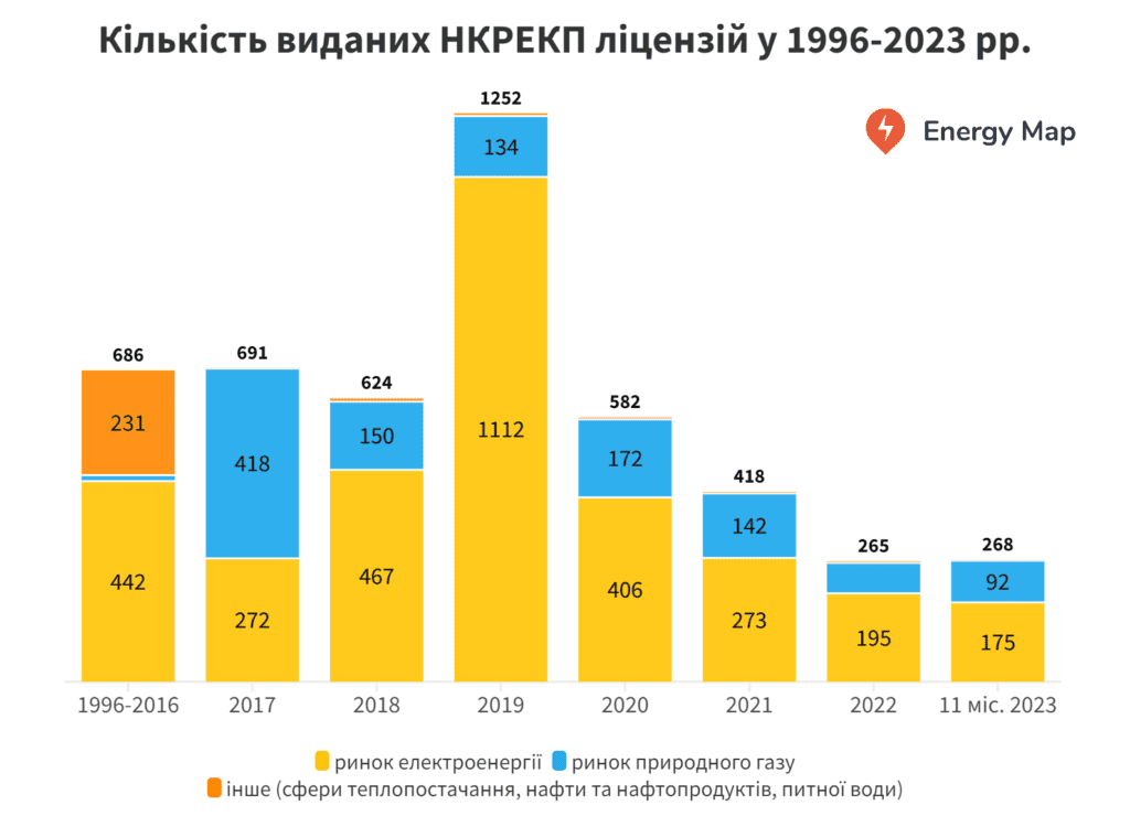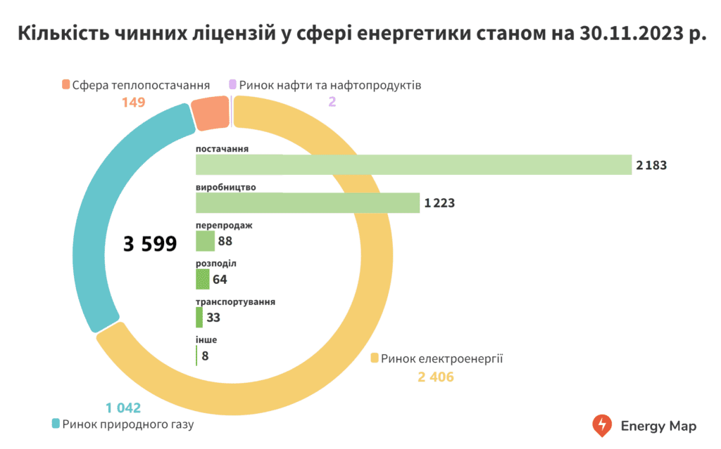 Під час війни найбільшу кількість ліцензій видано на діяльність з постачання електроенергії (243 або 49%) та природного газу (147 або 30%). 66 дозволів – на виробництво електроенергії, 30 – перепродаж, ще 1 – зберігання. 4 ліцензії видано на діяльність з виробництва тепла та 1 – розподіл природного газу.