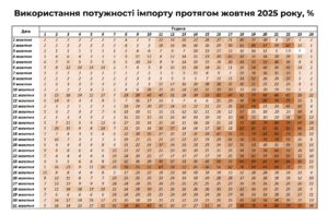 Максимальна погоджена комерційна потужність імпорту з ЄС з грудня 2024 року становить 2,1 ГВт (еквівалент двох великих енергоблоків АЕС). У середньому за жовтень 2025 року використання пропускної спроможності становило 22,6%, з максимумом 18 жовтня впродовж 20:00-21:00 (84,4%) та єдиною годиною за місяць, коли електроенергія не імпортувалась (3 жовтня впродовж 22:00-23:00). При цьому, у години пікового ранкового та вечірнього споживання використання пропускної спроможності суттєво зростає.