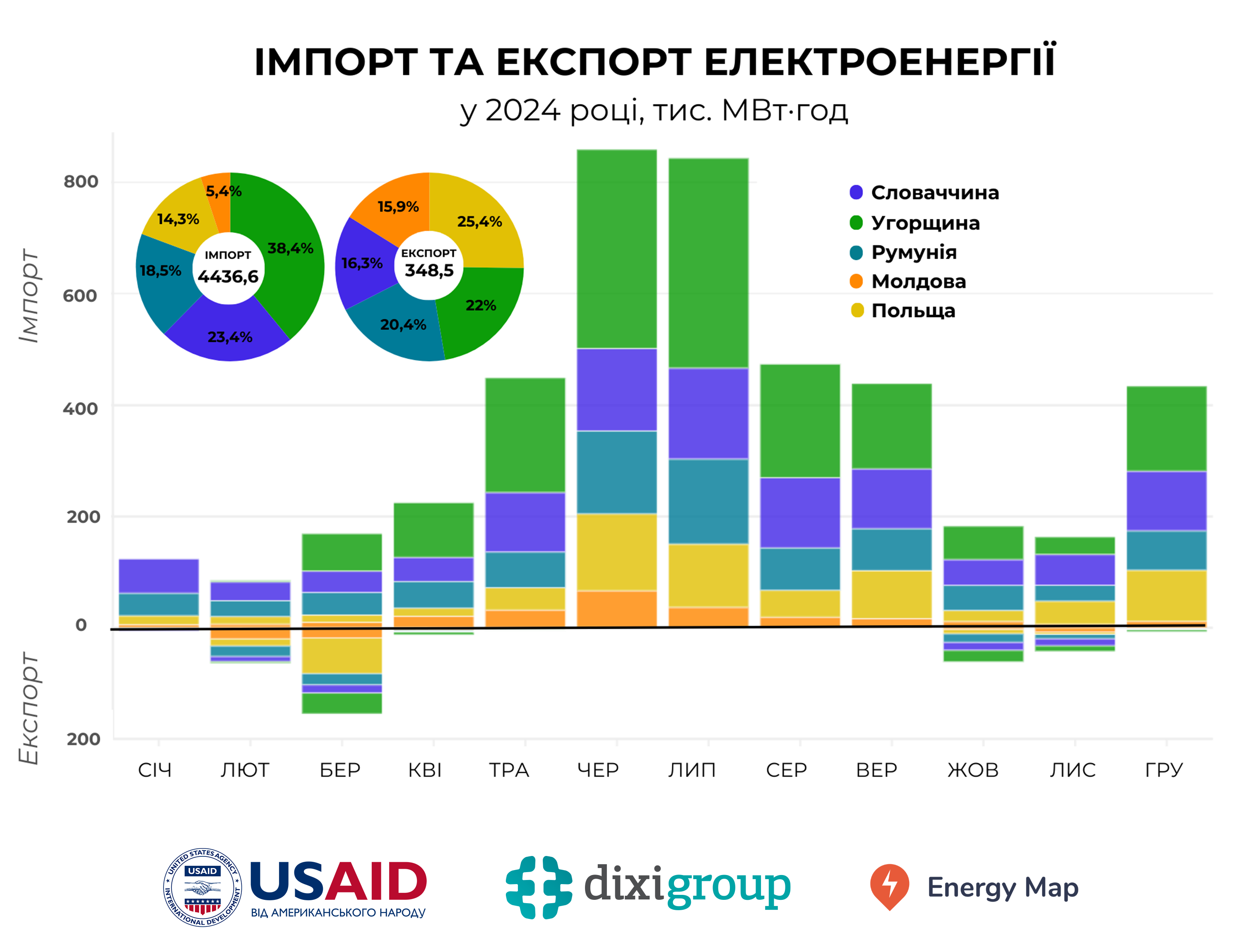 Також із Словаччини було імпортовано 1036,5 тис. МВт·год (23,4% загального обсягу), з Румунії – 819,6 тис. МВт·год (18,5%), з Польщі – 636,6 тис. МВт·год (14,3%) та з Молдови – 238,9 тис. МВт·год (5,4%).